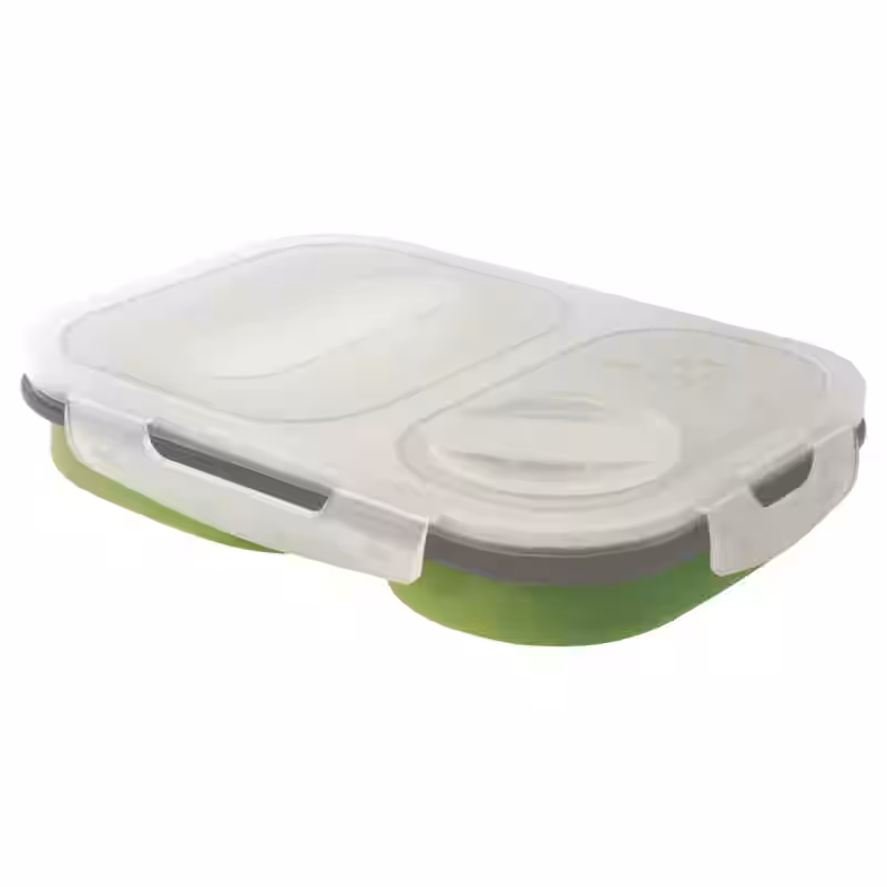 Die super klein faltbare Lunchbox mit Gabel und Löffel – aus hochwertigem flexiblem Silikon. Zum Verstauen wird die Box flach zusammengedrückt und paßt dann einfach in jede Staunische oder Tasche. Sie ist Lebensmittelecht, hitzebeständig, Spülmaschinenfest und Microwellengeeignet. Ob auf Reisen, beim Camping oder für den Lunch im Büro, diese Box sollte bei Ihnen im Haushalt nicht fehlen.