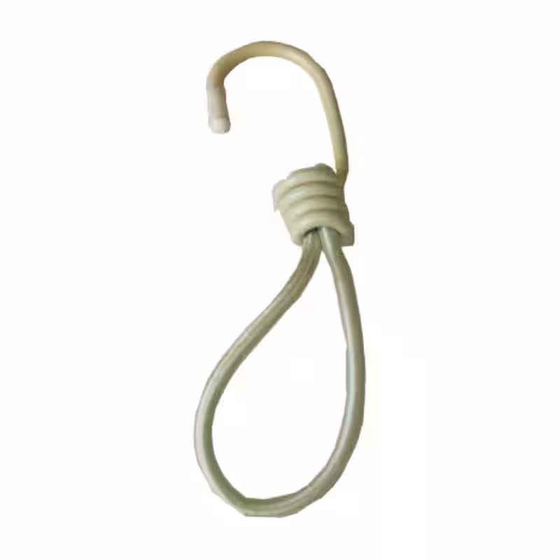 Der Zeltspannhaken ist aus Metall mit Gummischlaufe und ist leicht zu handhaben.
